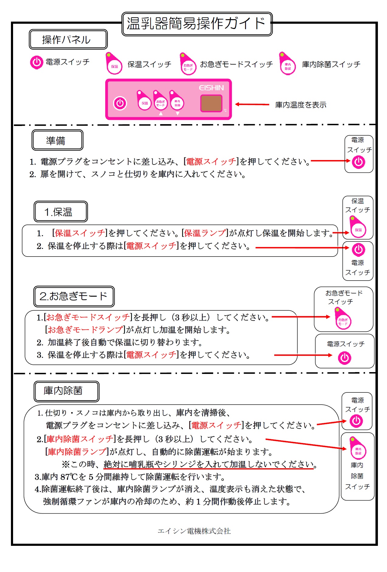 - マイコン制御で温度管理し、庫内温度はデジタル表示。高温熱風(87℃)による庫内除菌モードを搭載しています。